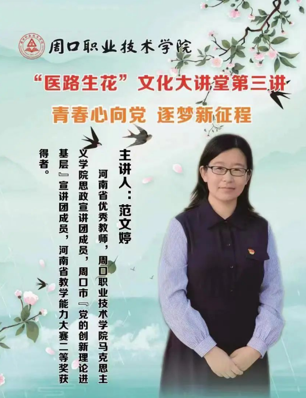 在五四青年节到来之际,为厚植爱国情怀,传承红色基因,5月2日下午taptap点点官方网站思政宣讲团成员范文婷老师受邀到校医学院开展了“医路生花——文化大讲堂”系列活动第三讲“青春心向党,逐梦新征程”,为入党积极分子和团学干部进行讲座。