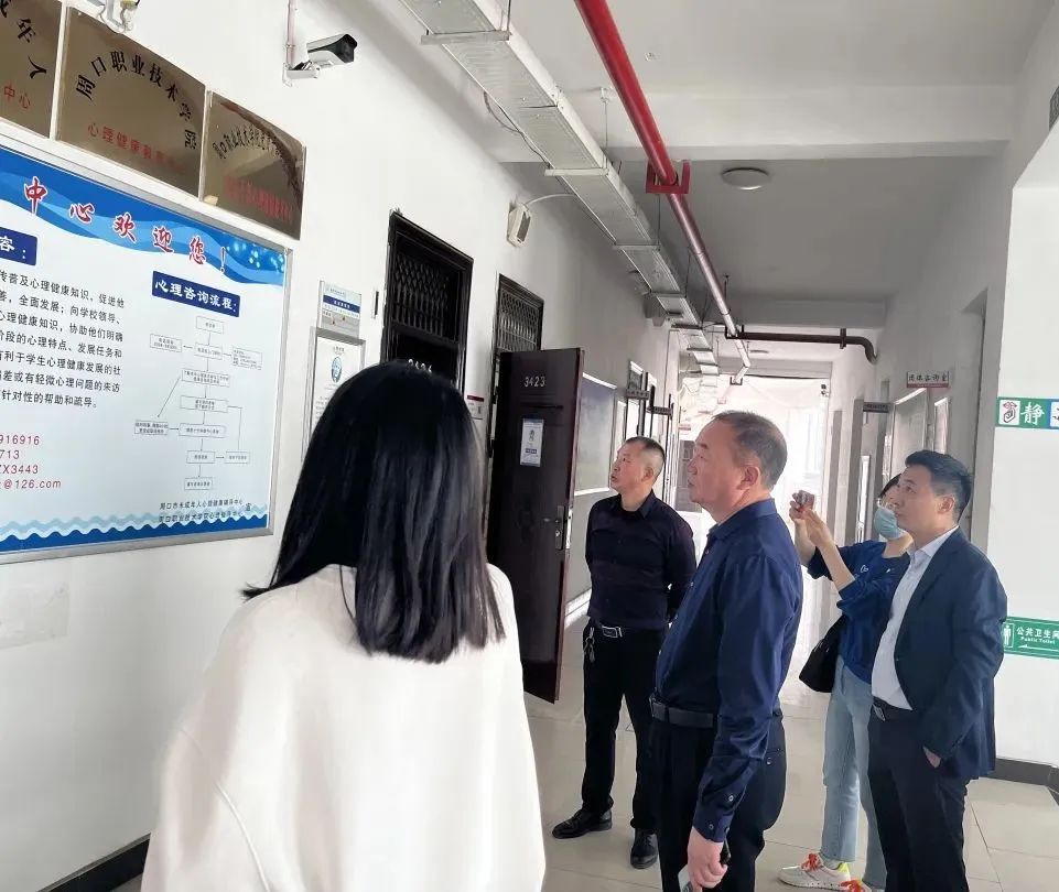 2023年4月17日上午,商水职业中专校长王玉祥带领老师来我校参观心理指导中心,学生处副处长苑建伟陪同参观,心理指导中心主任常瑞华负责介绍。