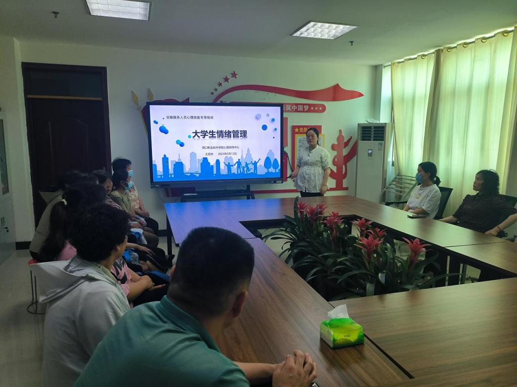 为了提升后勤服务人员的心理素养和应对压力的能力,周口职业技术学院于2023年5月9日在文昌校区举办了一场心理知识培训。此次培训由心理指导中心的资深教师王亚琳主讲,旨在通过专业知识的传授,帮助后勤团队成员更好地理解心理健康的重要性,并掌握有效的心理调适技巧。
