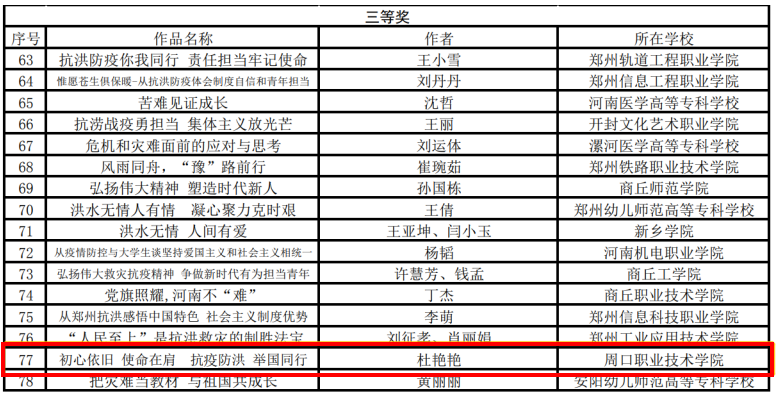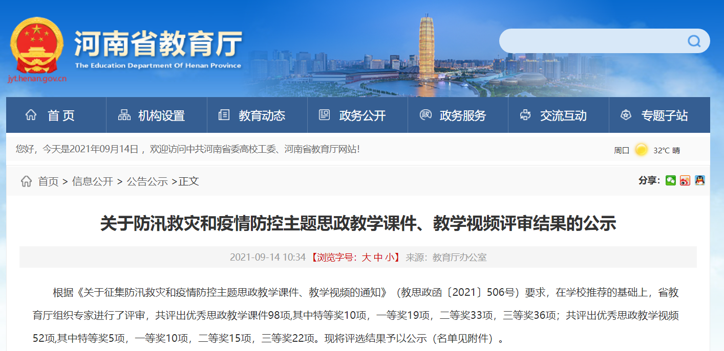 近日,河南省教育厅下发《关于征集防汛救灾和疫情防控主题思政教学课件、教学视频的通知》(教思政函〔2021〕506号),在学校推荐的基础上,省教育厅组织专家进行了评审,共评出优秀思政教学课件98项,我校思政部思政课教师杜艳艳的作品《初心依旧 使命在肩 抗疫防洪 举国同行》在竞赛中荣获三等奖!
