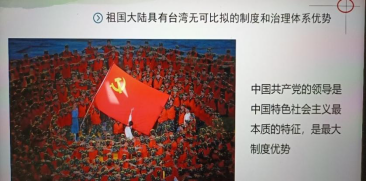 “祖国完全统一的历史任务一定要实现,也一定能够实现!”在纪念辛亥 革命 110 周年大会上,习近平总书记的重要讲话振聋发聩、掷地有声。通过本次宣讲,使同学们充分认识到:台湾问题因民族弱乱而产生,必将随着民族复兴而解决。100 年来,在中国共产党的领导下,中国人民历经苦难辉煌,拼来了山河无恙、家国安宁,创造了令世界刮目相看的伟大成就,迎来了中华民族伟大复兴的光明前景。尽管当前民进党当局勾连外部势力不断进行谋“独”挑衅冒进,造成台海局势紧张动荡,但在民族复兴的历史演进大势中,祖国统一的历史车轮必将滚滚向前。