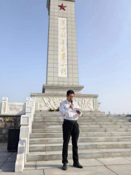 活动伊始,院长贾涛指出,祭奠革命先烈,就要像革命先烈那样勇敢顽强,勇于面对,就要像革命先烈那样宁死不屈,保持中华民族的气节。要不辜负先辈们的期望,继承革命先烈的遗志,大步迈向灿烂的明天。随后,师生们在庄严肃穆的氛围中向革命烈士纪念碑默哀、献花,深切缅怀革命先烈的丰功伟绩,汲取精神力量,砥砺初心使命。现场党员重温入党誓词,告慰先烈、传承遗志。学生代表致悼词,在追思中感悟先辈不易,在悼念中坚定心中理想。